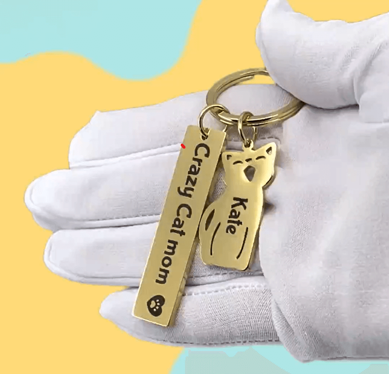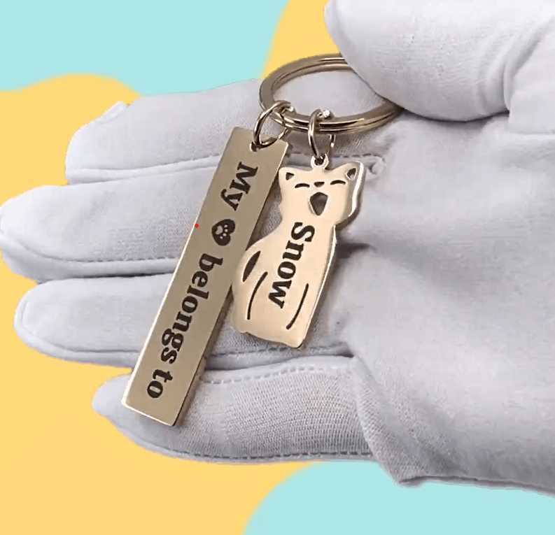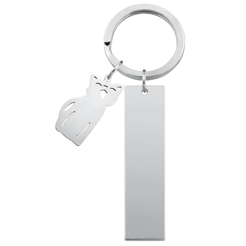 • Portachiavi Personalizzato Rettangolare Inciso con Ciondolo a forma di Gatto